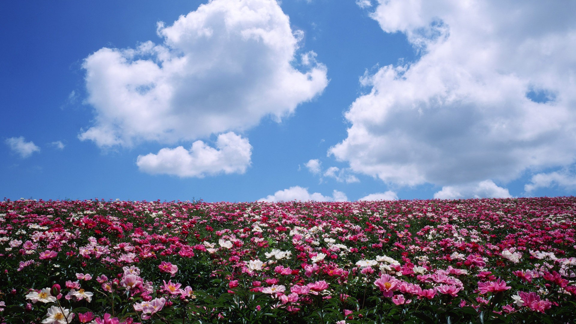 Vallée fleurie sous un ciel légèrement nuageux bleu