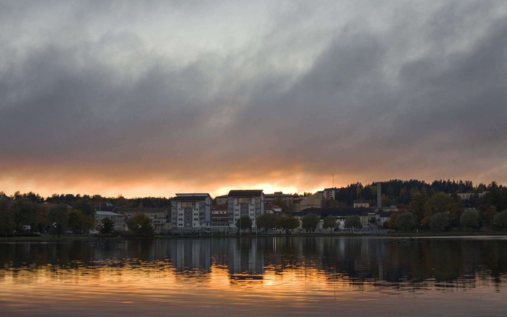 Coucher de soleil sur la rivière sous les nuages ténébreux
