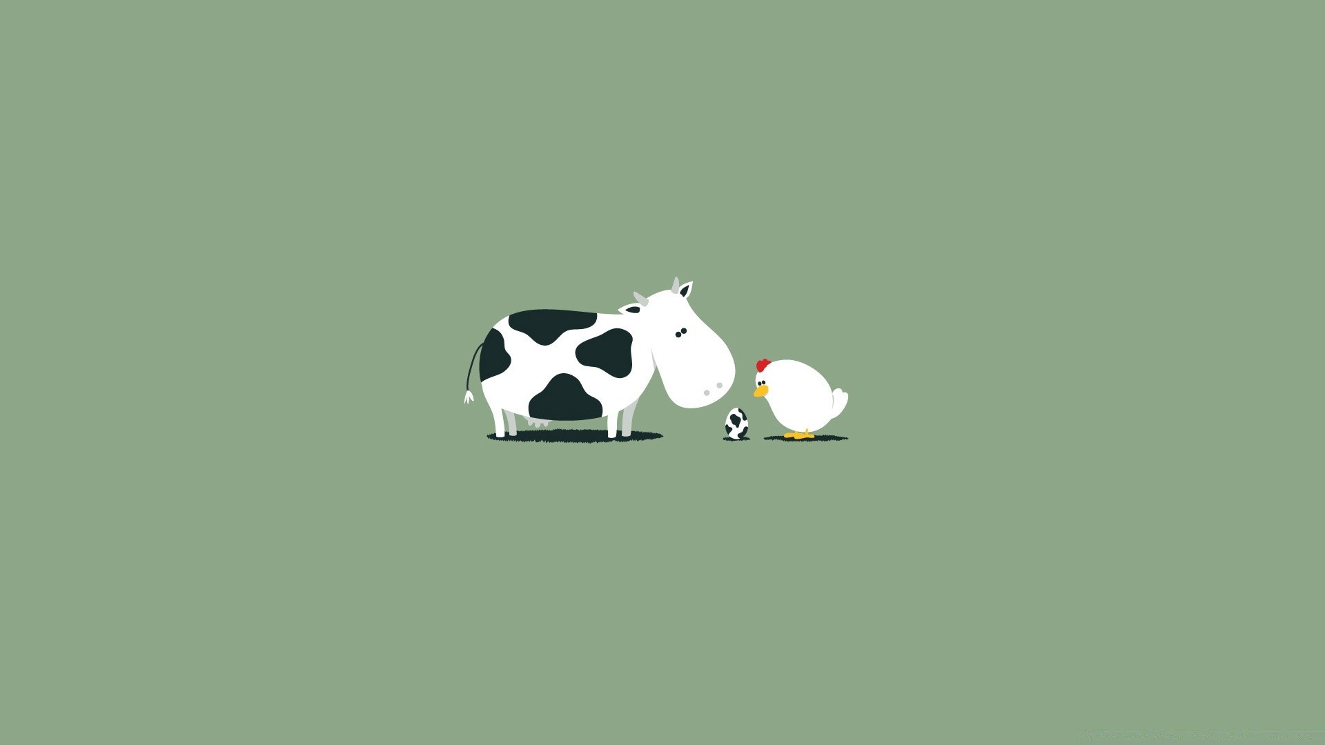 La vache et le poulet de bande dessinée regardent l'œuf tacheté