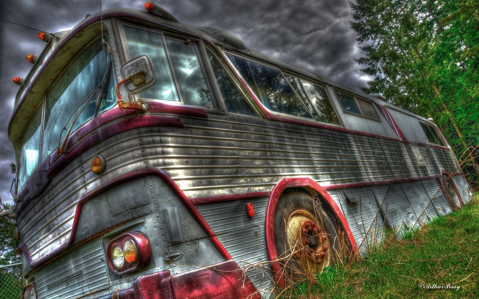 Bus dans un style post-apocalyptique dans la forêtBus dans un style post-apocalyptique dans la forêt