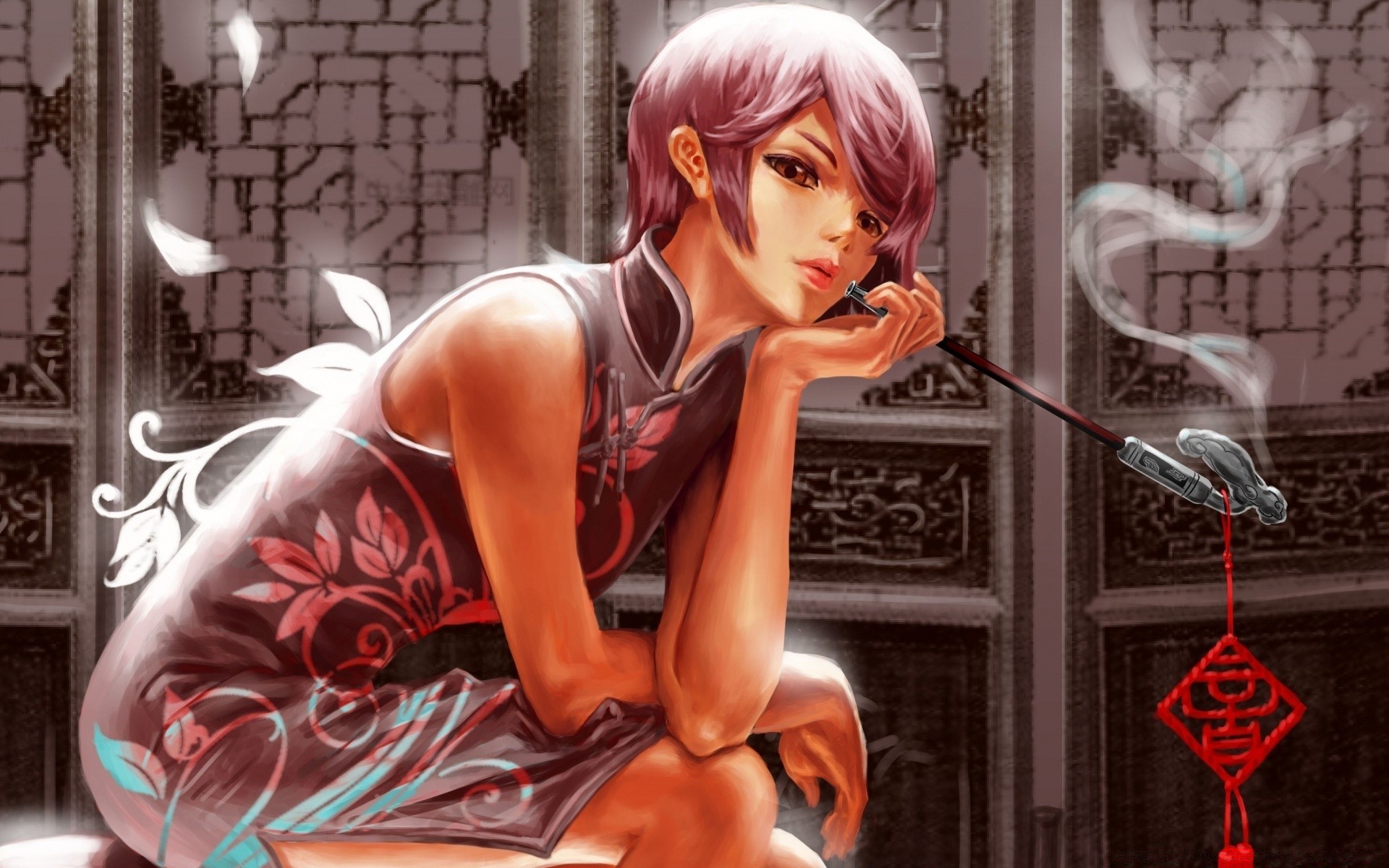 Illustration anime d'une fille avec une queue de cheval avec des cheveux violets