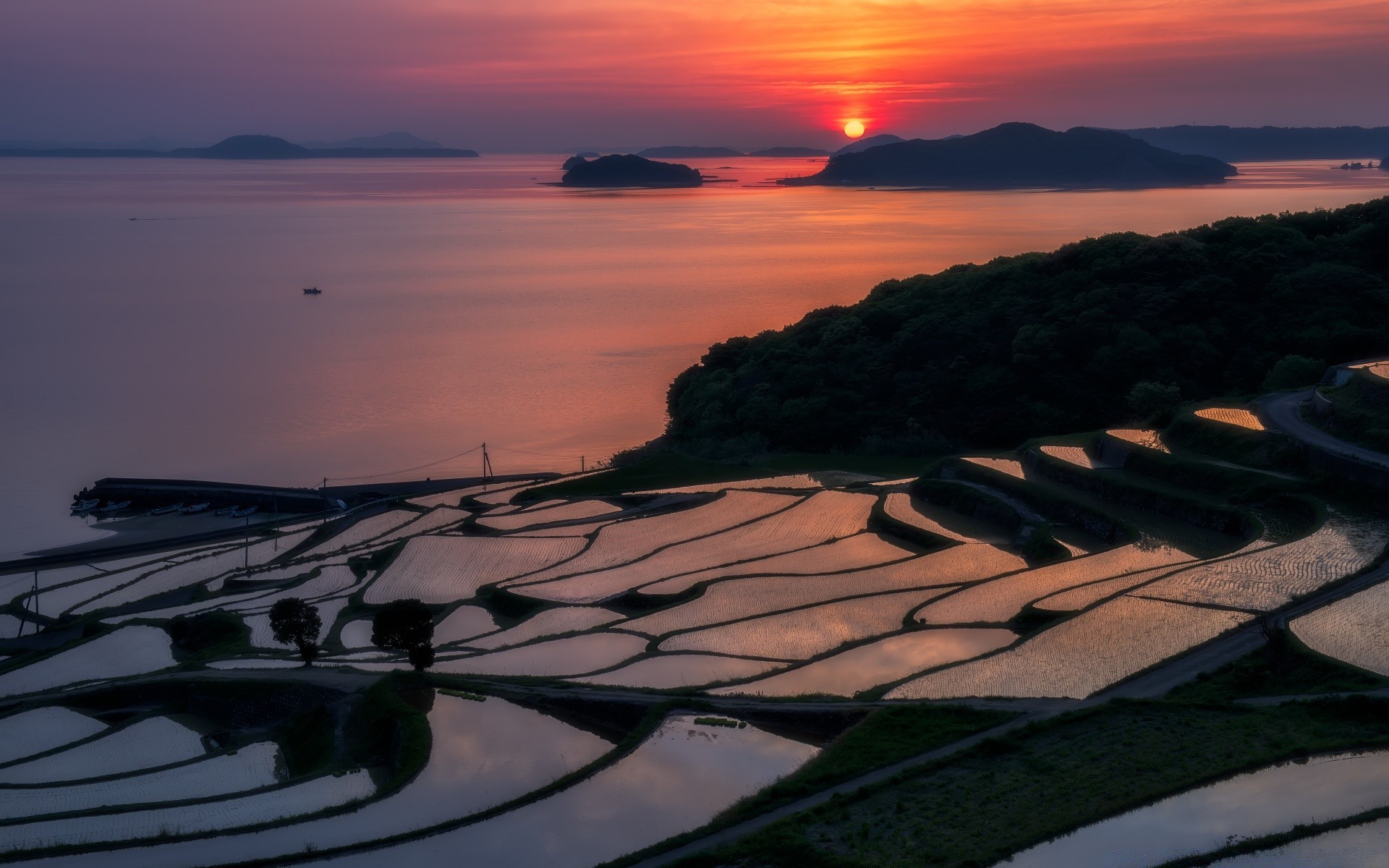 Vue sur la surface de la mer qui coule au-delà du bord de l'horizon du soir, deux rochers Solitaires se regardent