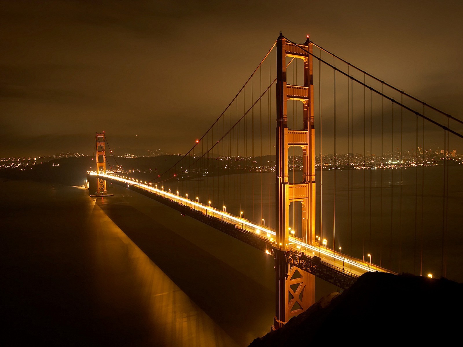 Photo de nuit de la baie avec le pont et la ville de nuit dans les lumières