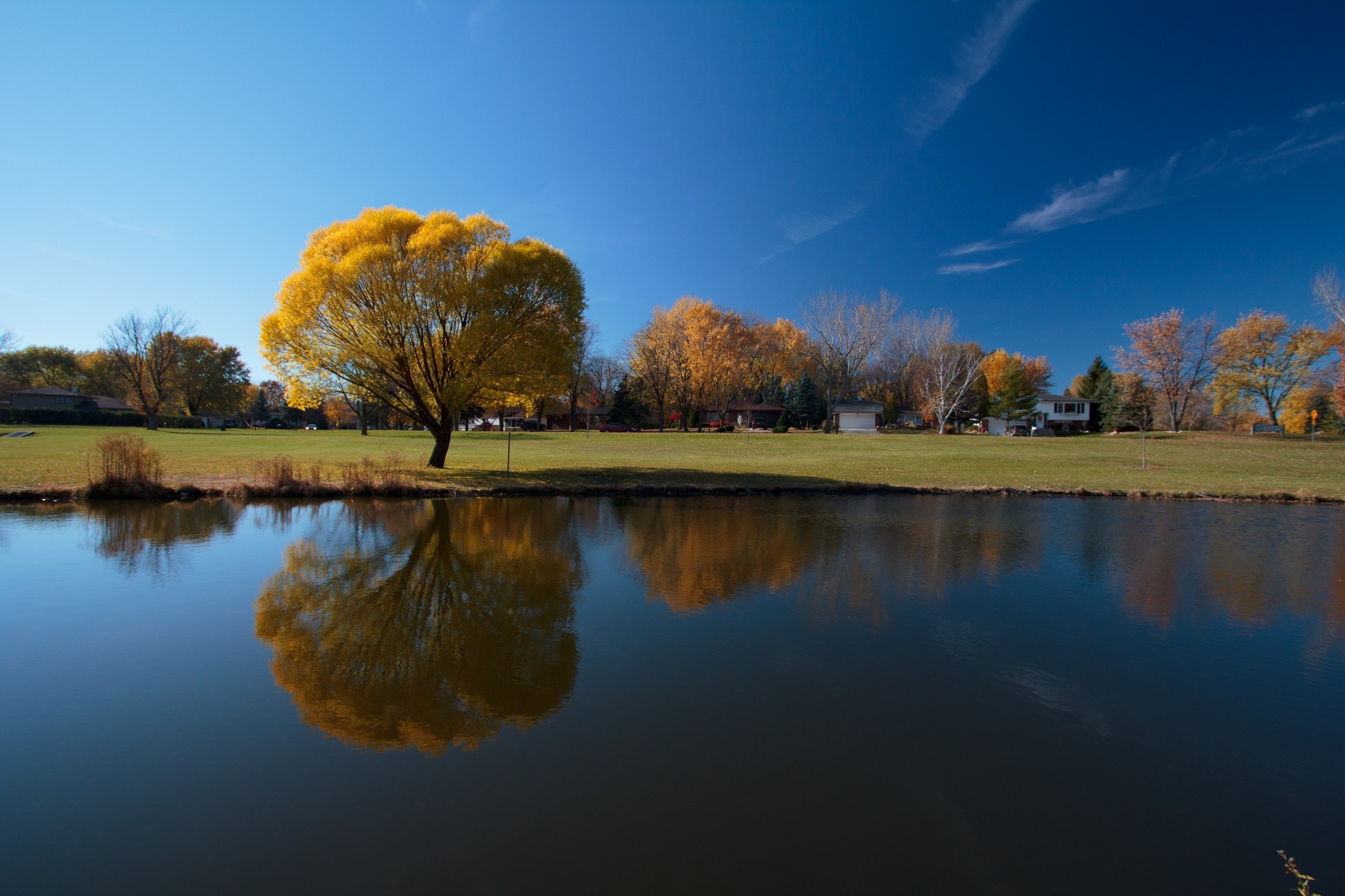 Arbres en tenue d'automne qui se reflètent dans la surface du lac par temps clair et sans vent