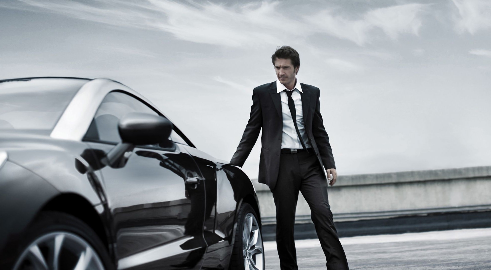 Un homme en costume se tient près d'une voiture noire