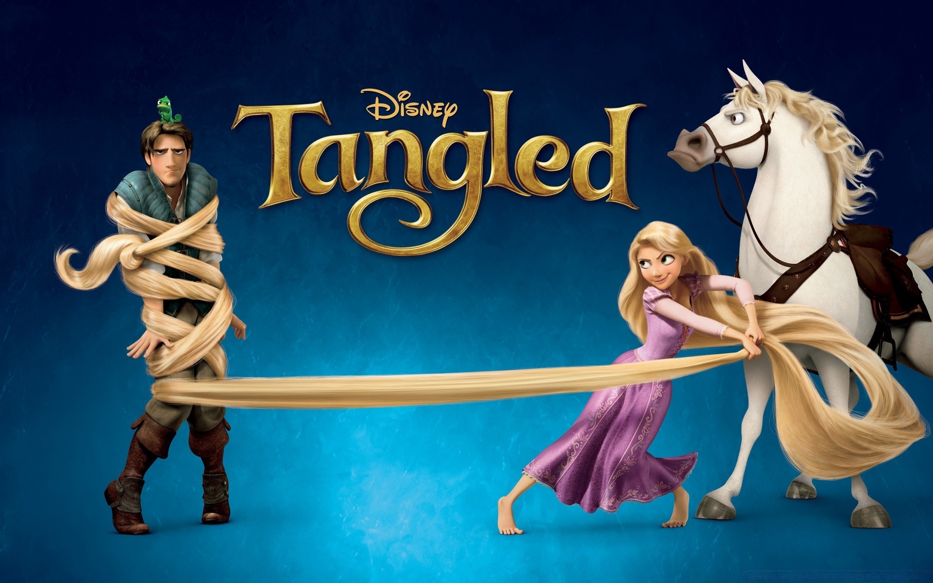 Image du dessin animé Raiponce avec un cheval sur l'herbe