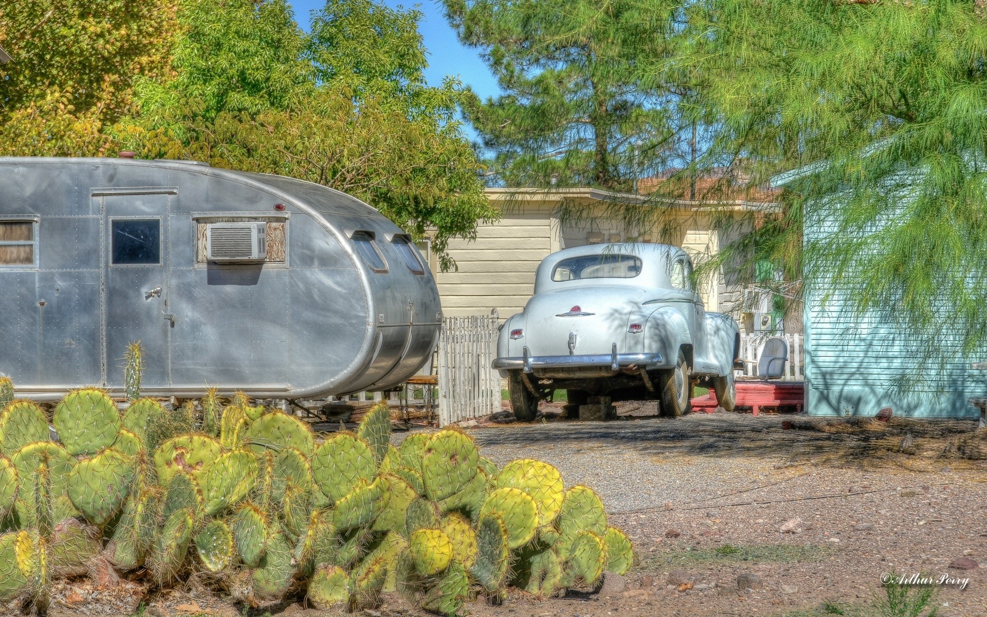 Cactus, vieille voiture, maison-wagon, apprendre la terre