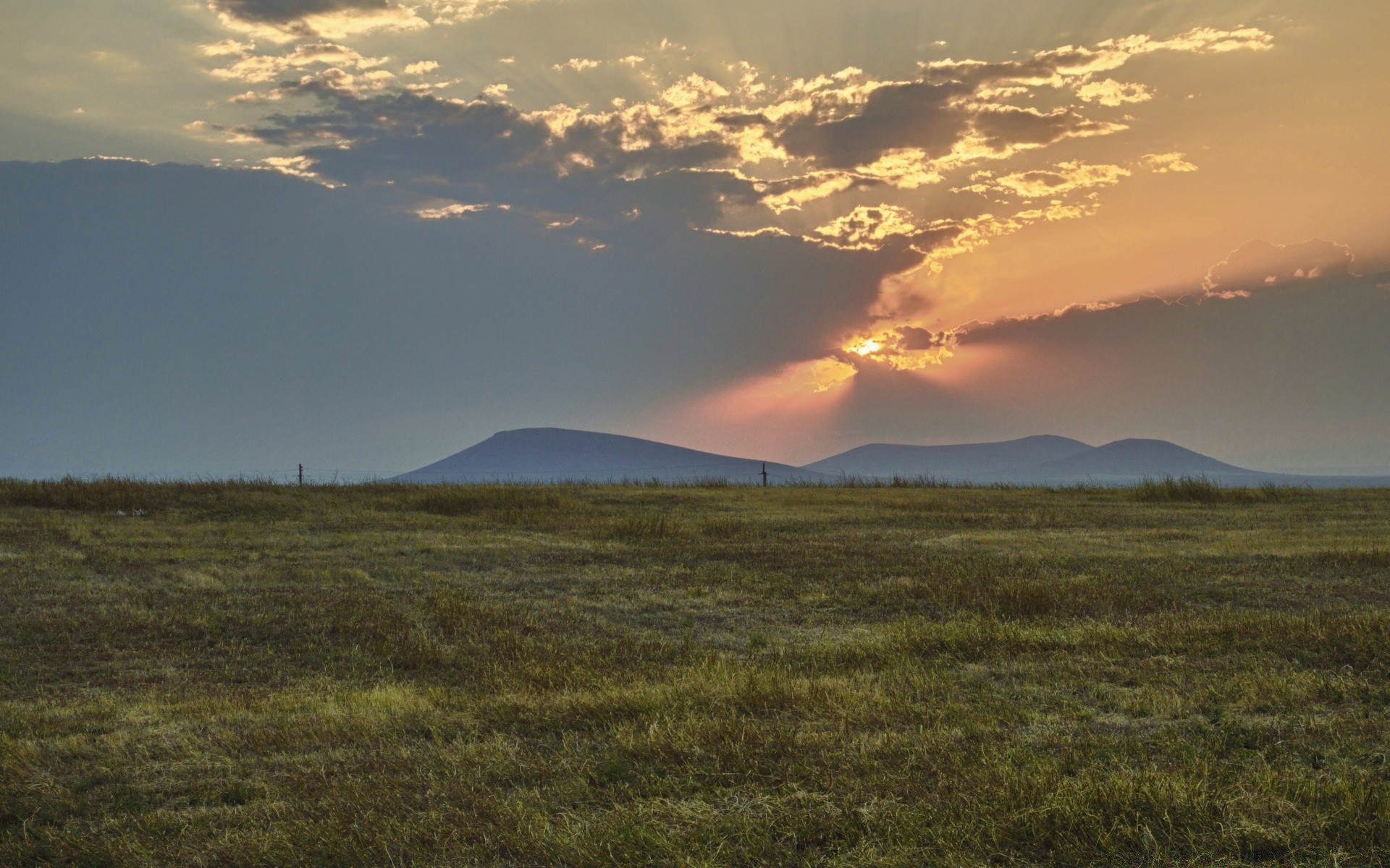 Coucher de soleil derrière les collines dans la steppe sans fin