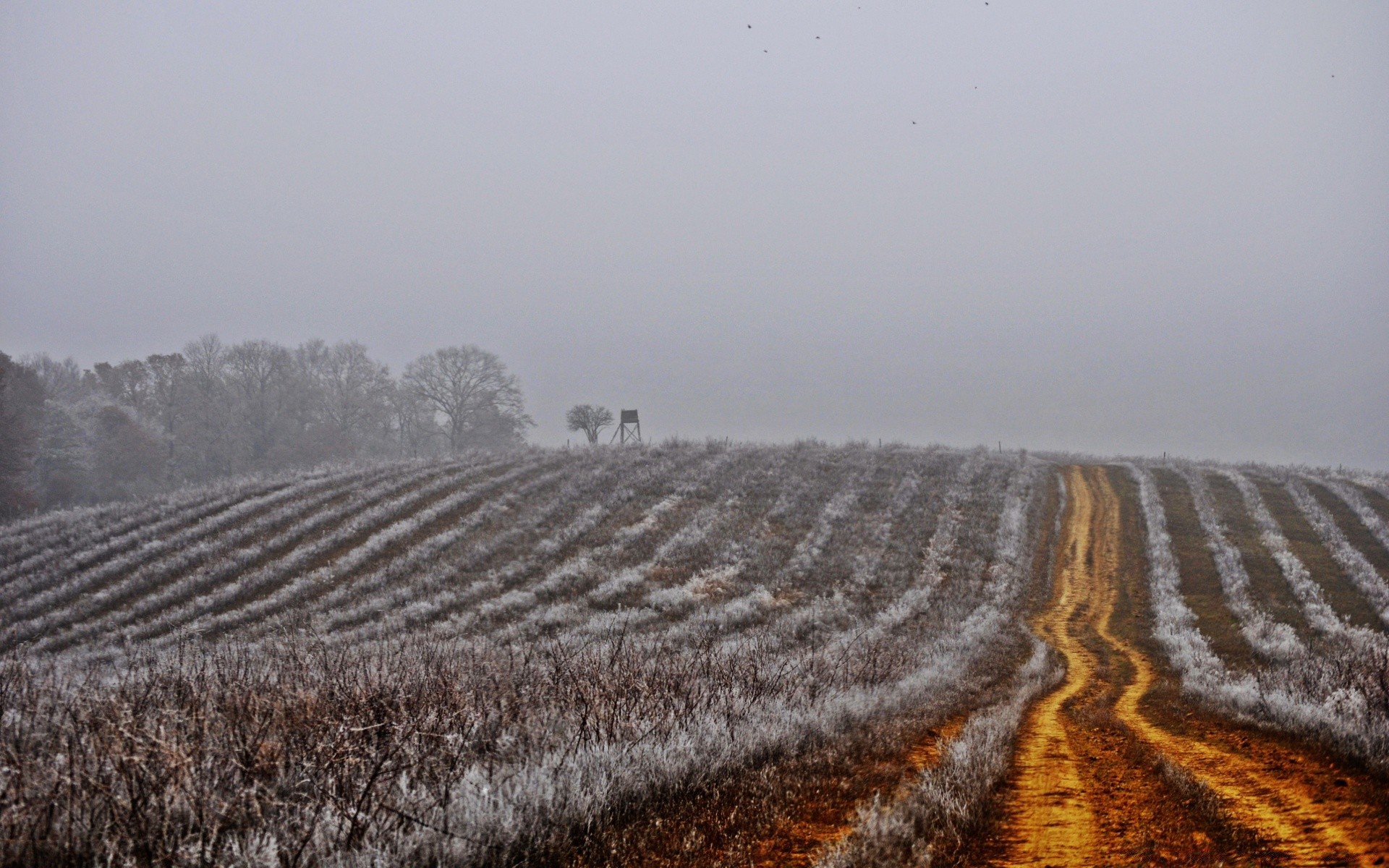 Ciel sombre sur la route dans un champ avec un arbre solitaire