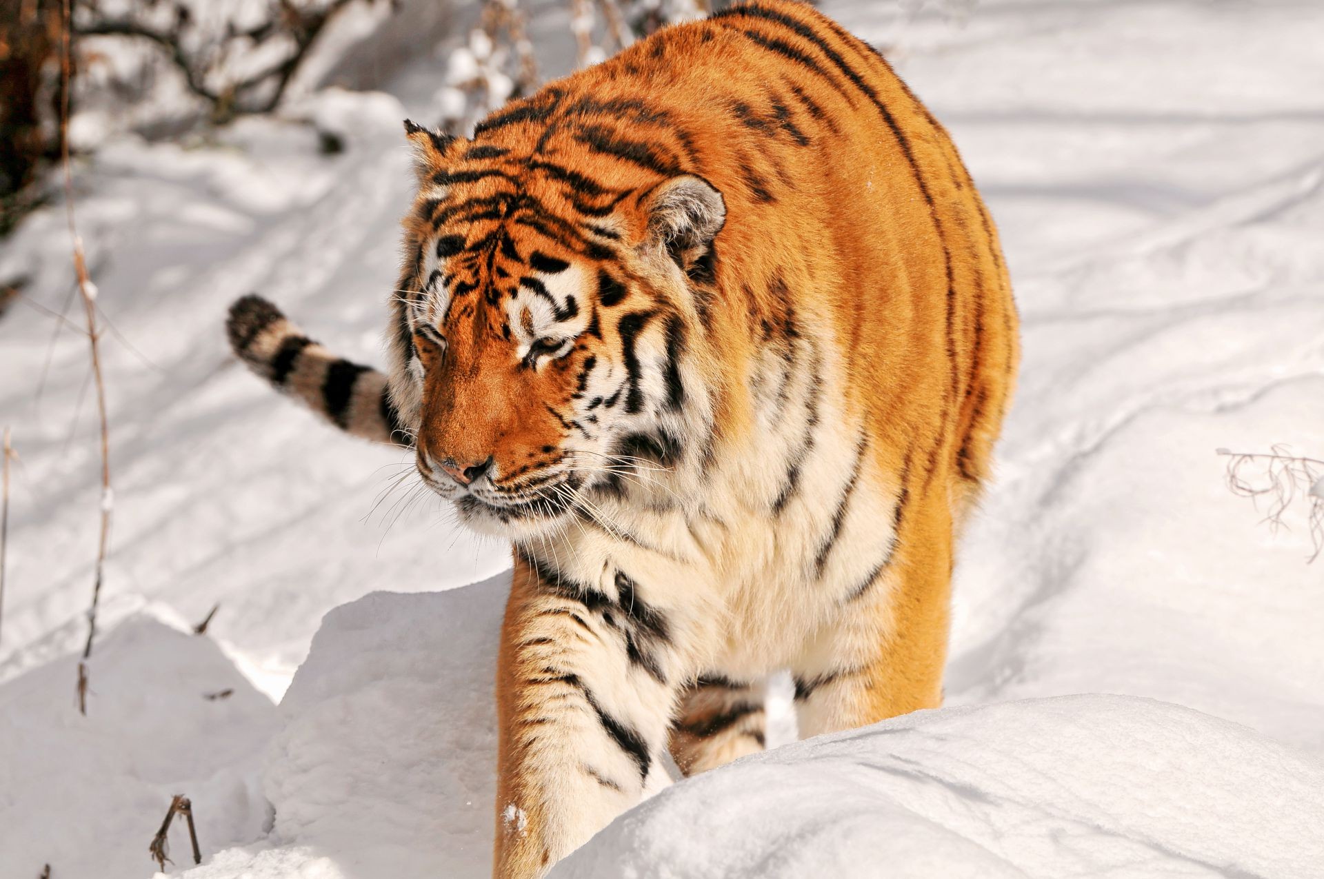 Tigre se promène dans la neige blanche