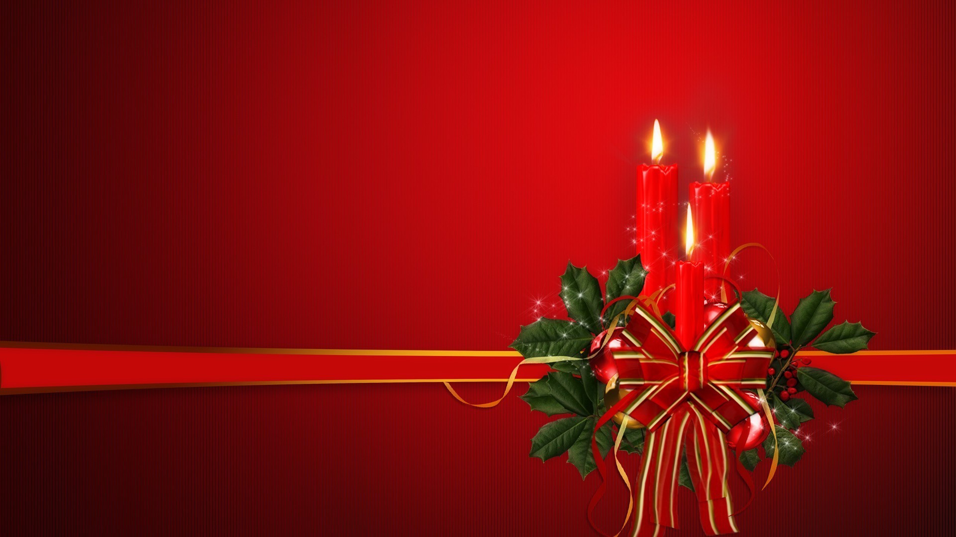 Trois bougies rouges ornées d'un arc de cadeau et de branches de sapin