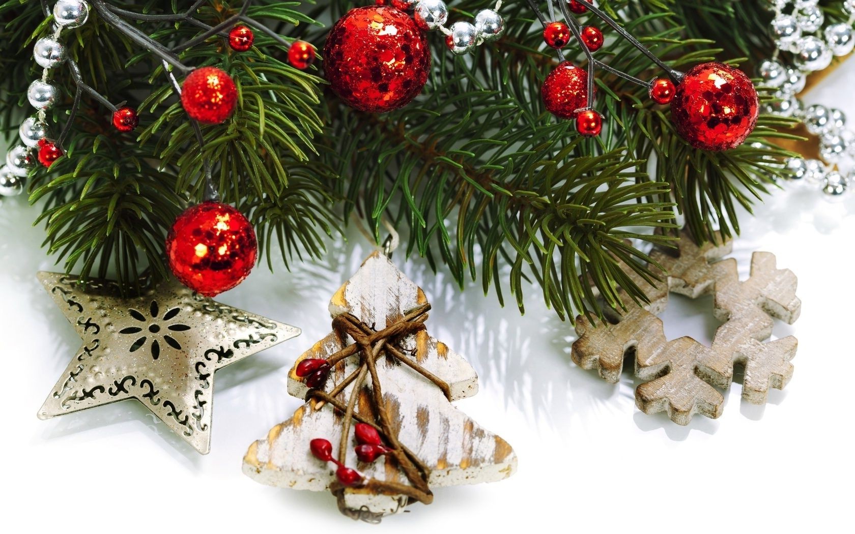 Branche d'épinette avec des boules rouges et des perles