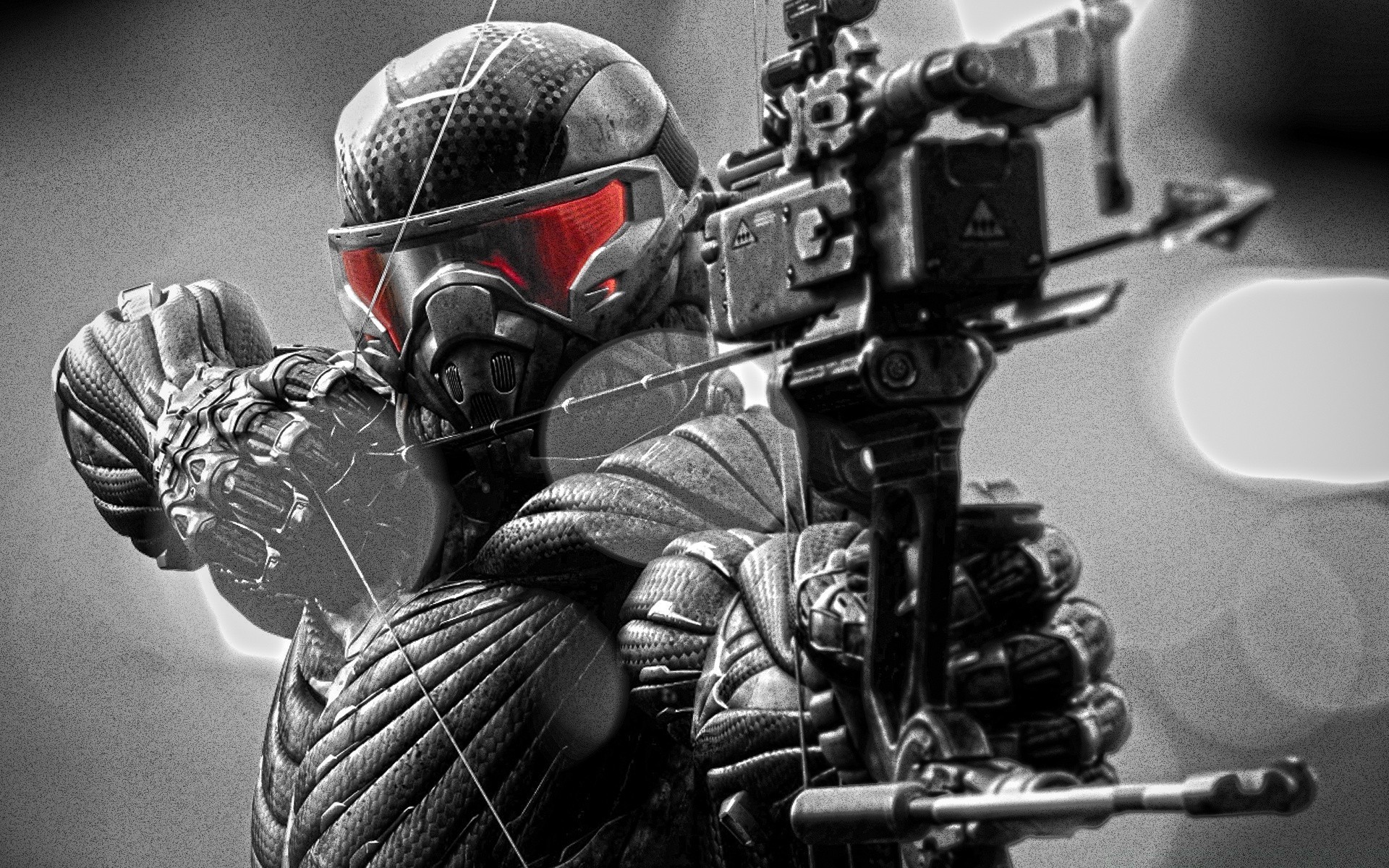 Le héros du jeu Farcry, armé, debout sur le fond d'un paysage de montagne