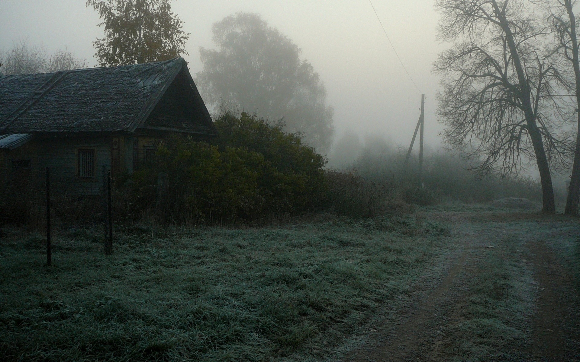 Route brumeuse avec une vieille maison