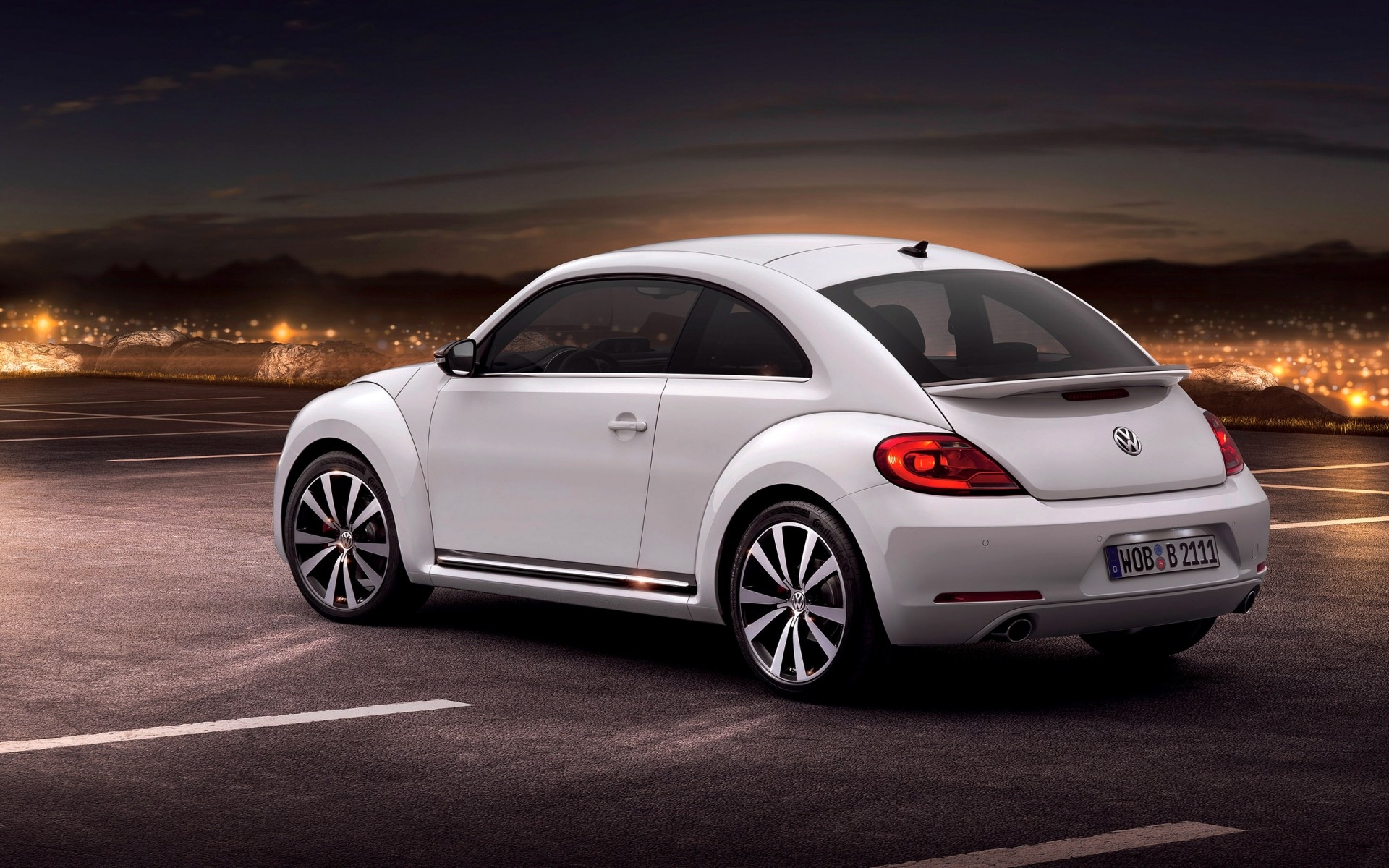 Voiture Volkswagen rouge se dresse sur la neige sur fond de montagnes