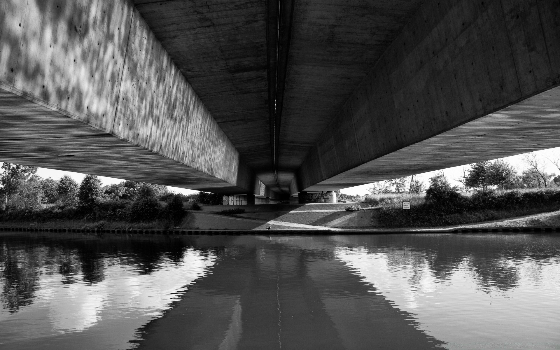 Fenêtre en noir et blanc donnant sur un bâtiment solitaire