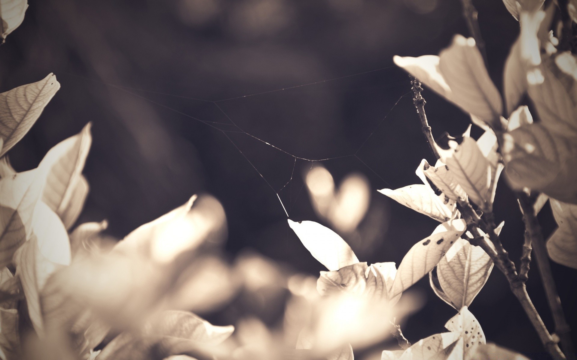 Photo Vintage de la nature, feuilles avec une toile d'araignée suspendue sur eux, sur fond flou