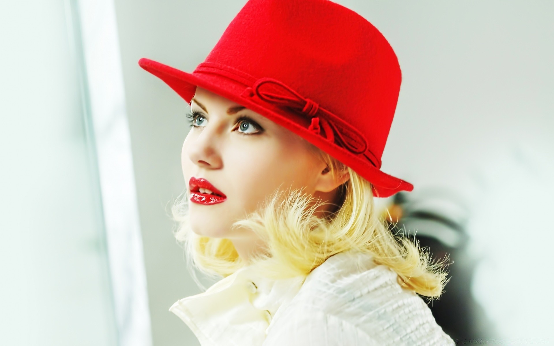 Jolie blonde en mini robe rouge sur fond de mur avec des coeurs
