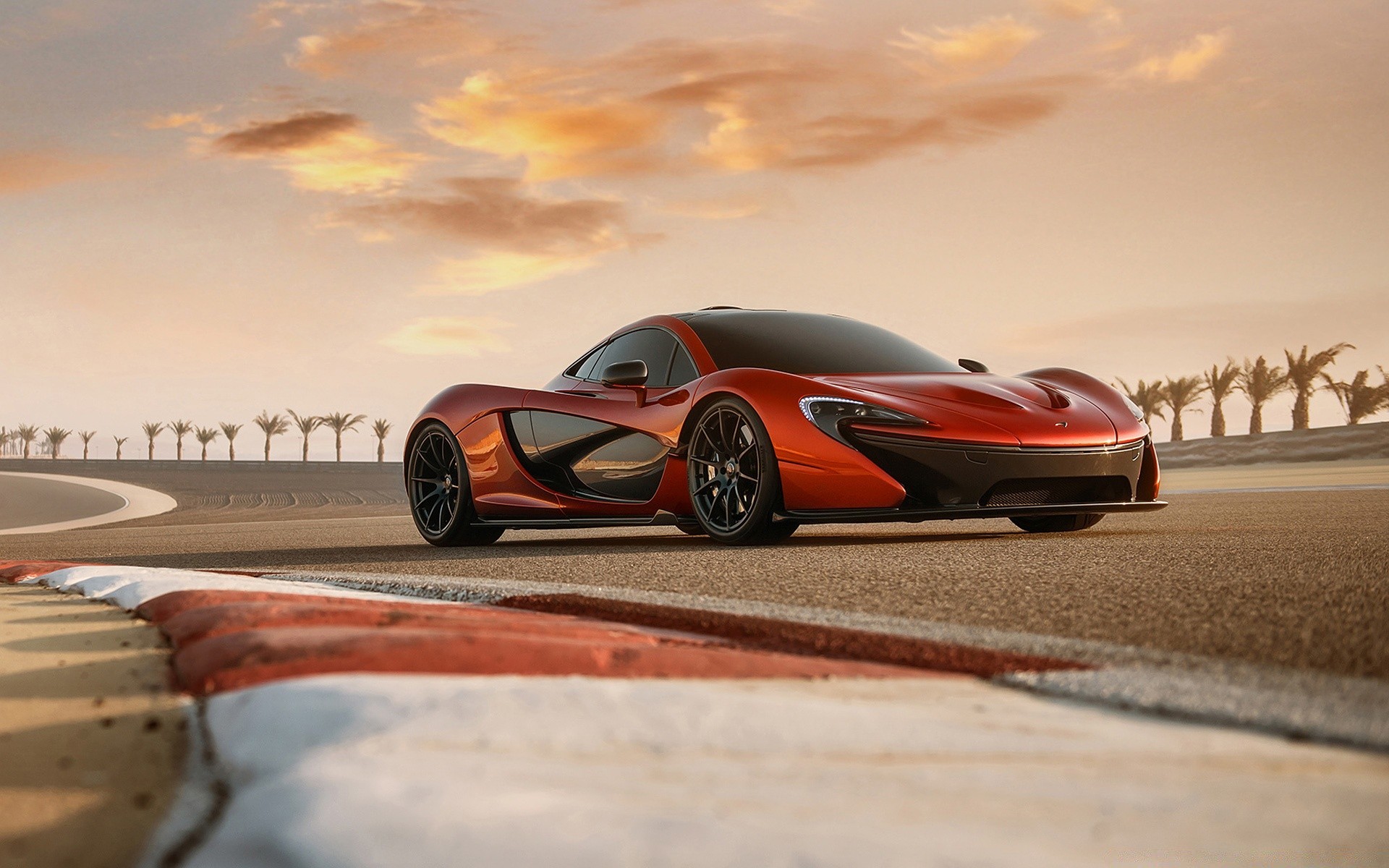 Voiture de sport rouge au coucher du soleil parmi les palmiers