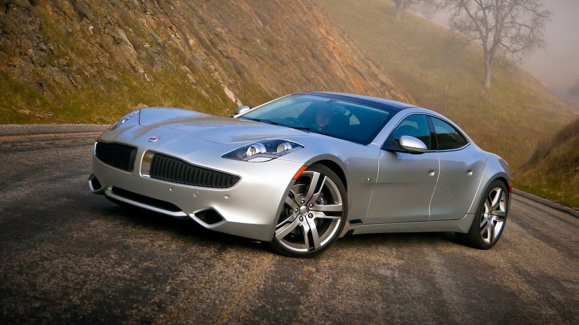 Une voiture de sport argentée se dresse sur la route parmi les collines verdoyantes