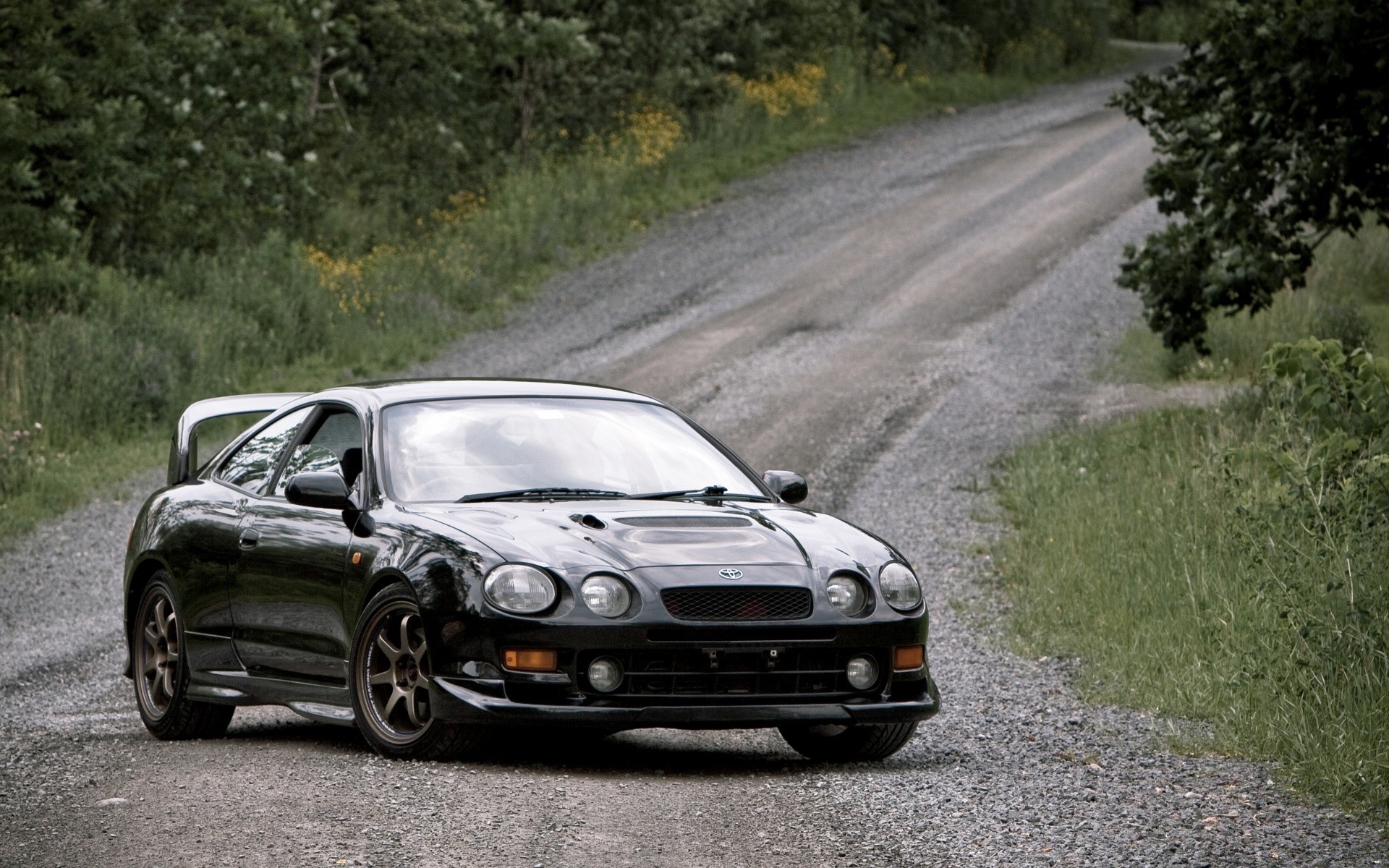 Voiture noire Toyota Celica T200 GT-four se dresse sur un chemin de terre