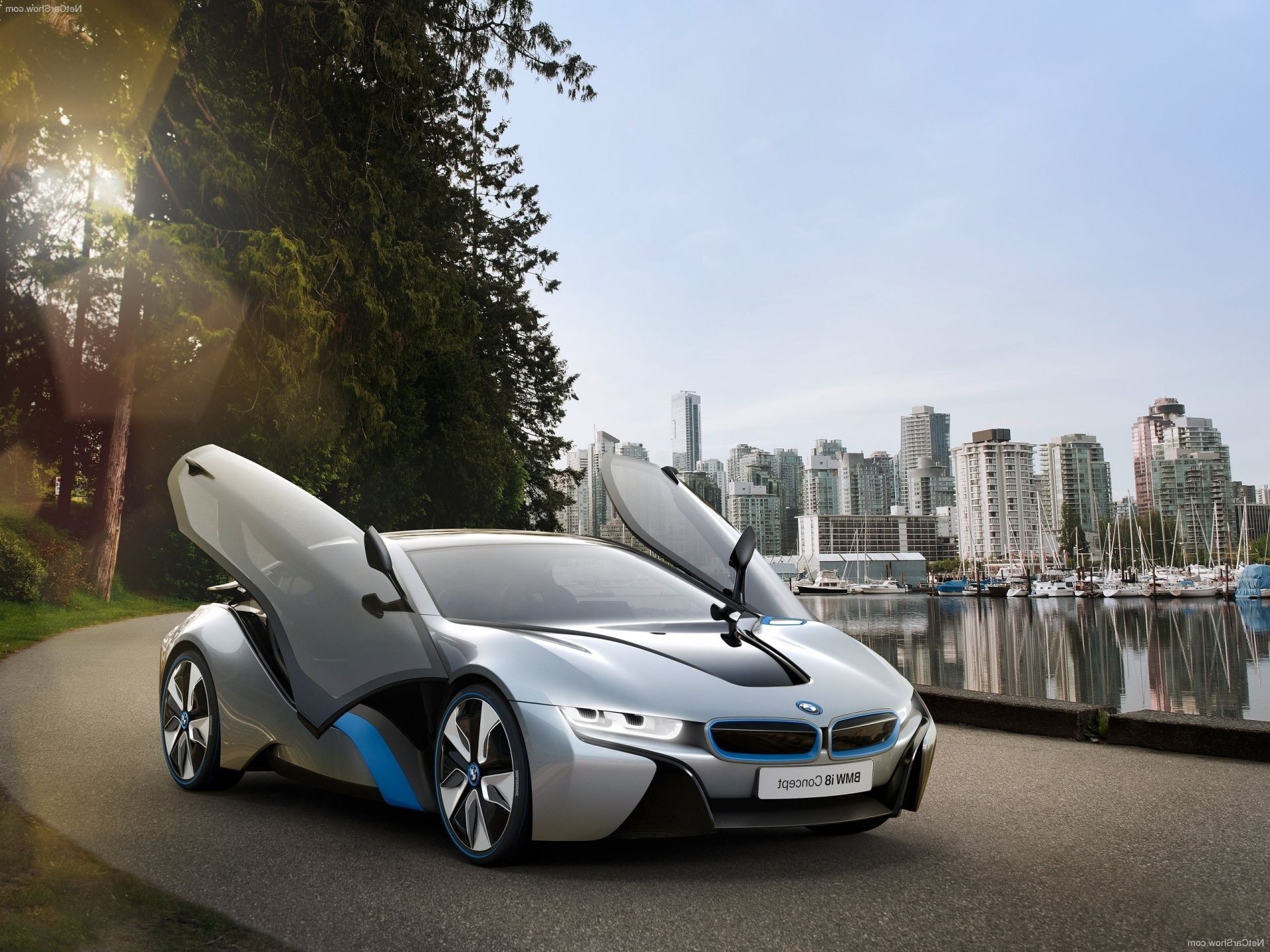 Une voiture blanche se tient sous le pont