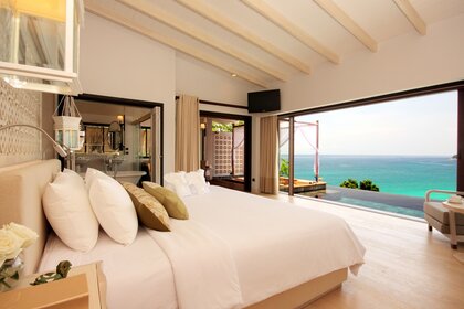 Chaises longues sur la terrasse du chalet avec vue sur la merChaises longues sur la terrasse du chalet avec vue sur la mer