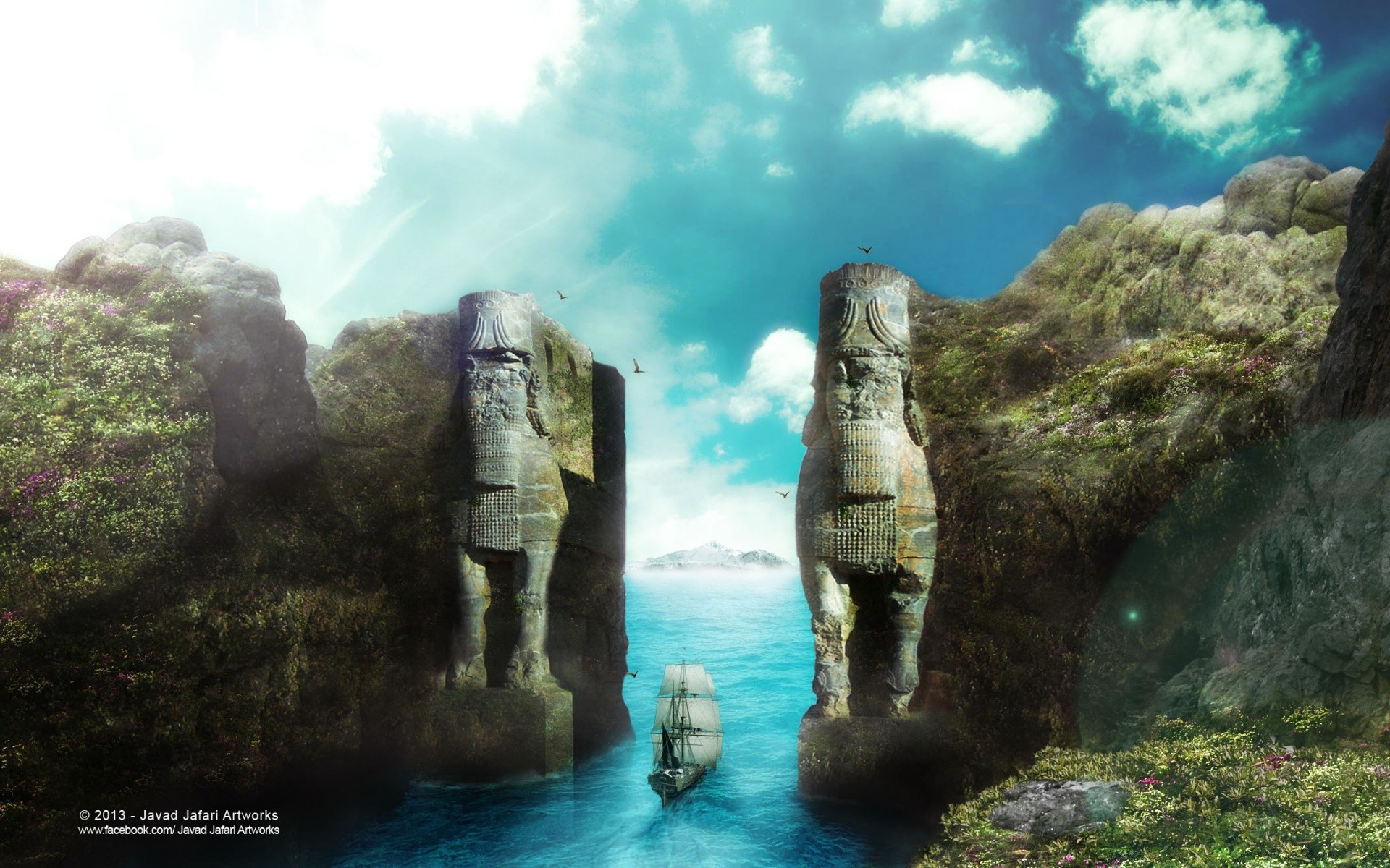 Le navire navigue au-delà des falaises étonnantes avec des sculptures ciselées